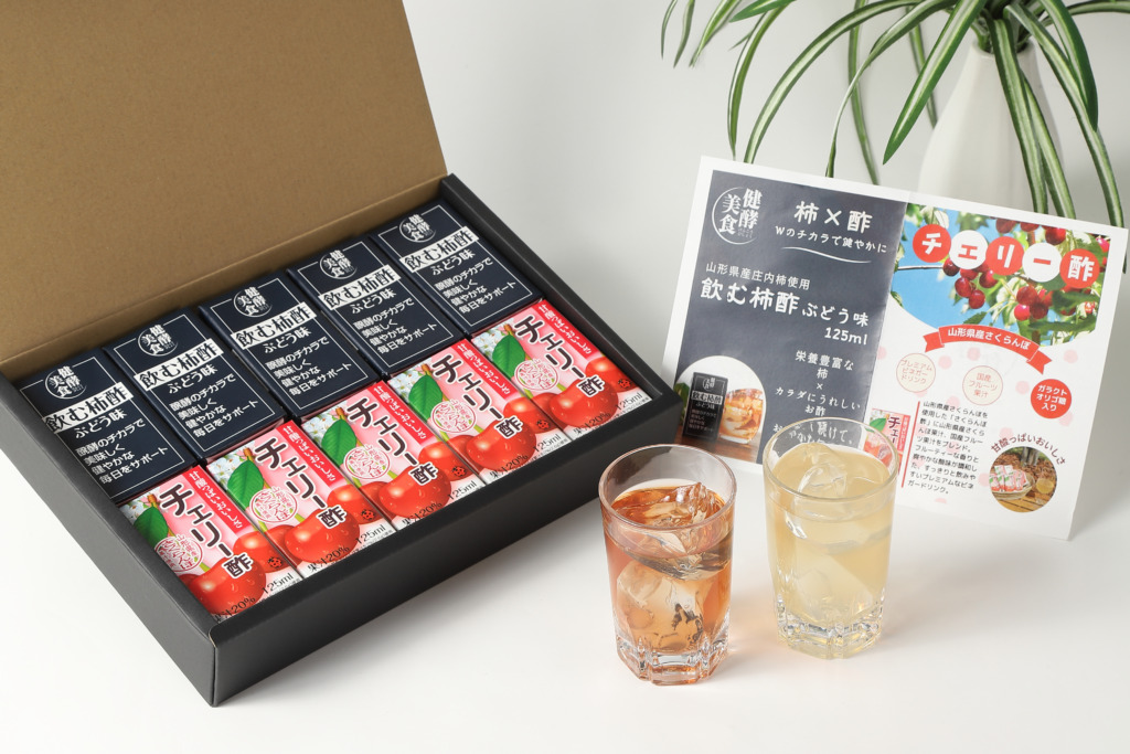 山形県産さくらんぼを使用した「チェリー酢」と山形県産庄内柿を使用した「飲む柿酢ぶどう味」のセットです。