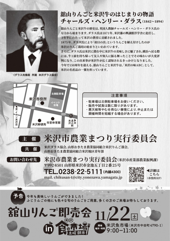 チャールズ・ヘンリ―・ダラス氏とつながりがあり、今年で共に150周年を迎える舘山りんごと米沢牛、若手農業者による軽トラ市の1日限定のコラボイベントを開催します。多くの方のご来場、お待ちしております。