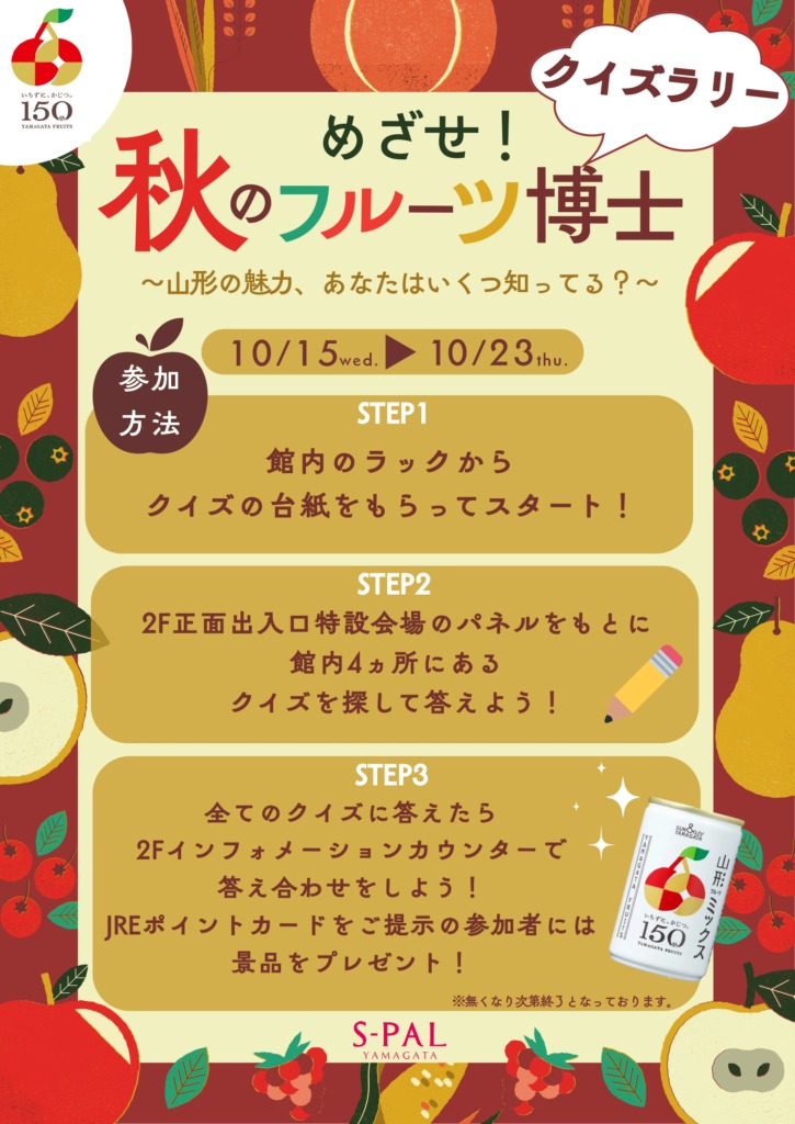 【クイズラリー】山形の秋のフルーツに関するクイズラリーを開催2F正面出入口の展示をヒントに館内4ヵ所にあるクイズに答えよう!全問回答されたJRE POINT会員証をお持ちのお客様には景品がプレゼントされます。期間:10月15日(水)~10月23日(木)場所:場所:①1階 日本一前②3階 サニーコート③4階 エレベーター脇④5階 エレベーター脇