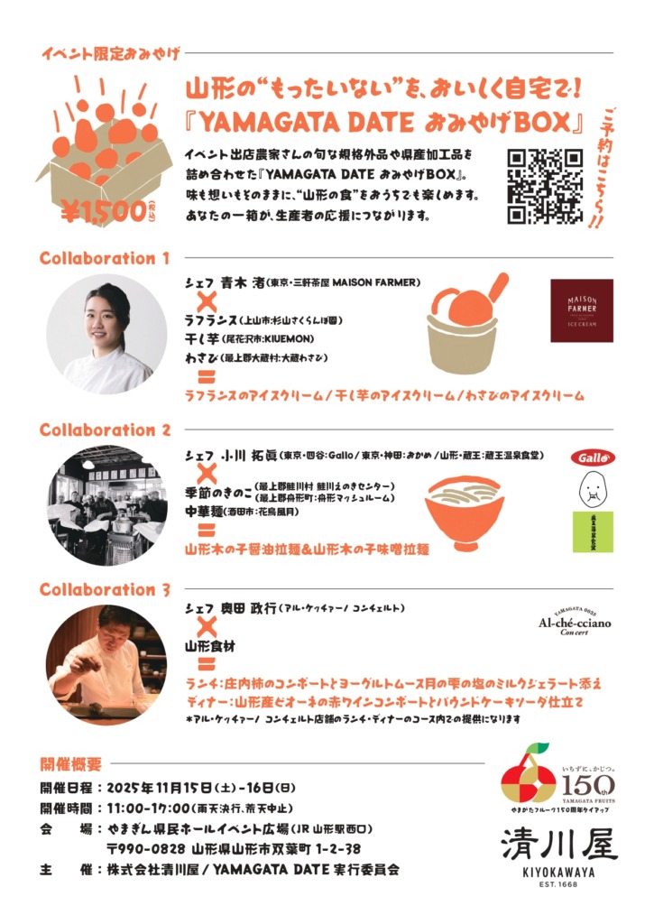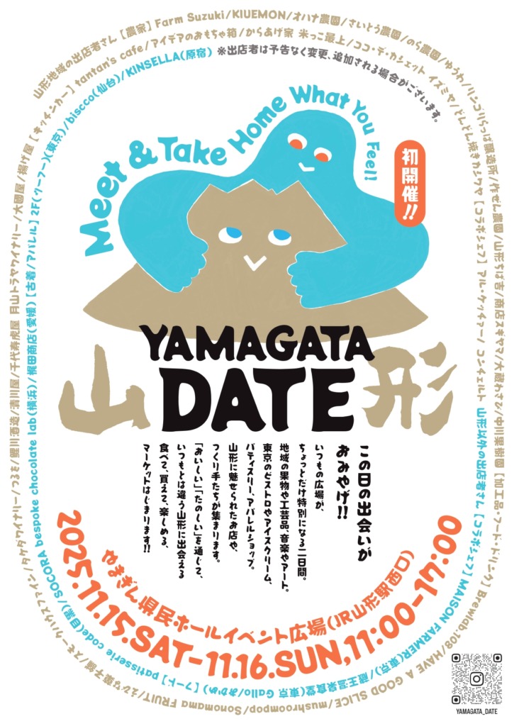 開催日:2025年11月15日(土)・16日(日)時間 :11:00〜17:00会場 :やまぎん県民ホール イベント広場 (山形駅西口)主催 :株式会社清川屋/YAMAGATA DATE実行委員会出店数:のべ約50店舗(農産物・加工品・飲食・クラフト・古着ほか)